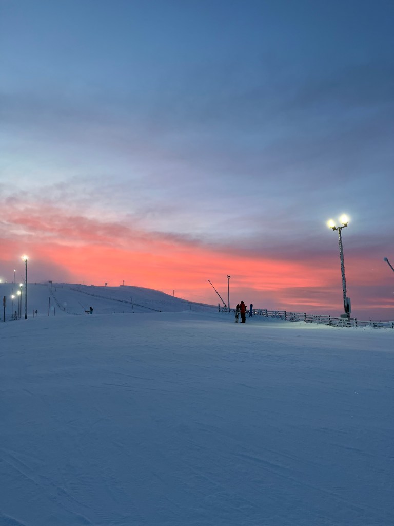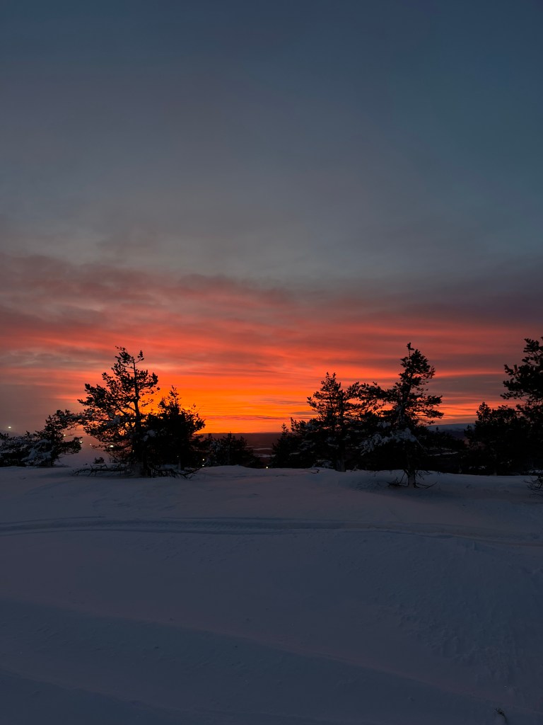 La Santa’s Cabin è una casa abbandonata in legno che era stata costruita per girare un film di Natale, poi lasciata lì perché quando ghiaccia è molto scenografica. Purtroppo quest’anno (dicembre 2024) il freddo è arrivato un po’ tardi anche in Lapponia quindi la casa non era ricoperta di neve ghiacciata come si vede dalle foto sul web. Comunque sciare sotto il cielo perennemente infuocato ne è valsa la pena!